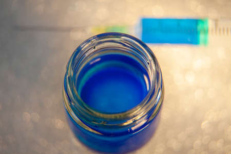 Close up Photo of Bottle and Syringe With Same BlueLiquid on Sunny Light Background