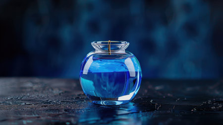 This image features a clear glass container filled with blue liquid, accented by a gold element, placed on a dark textured surface. Ideal for designs.