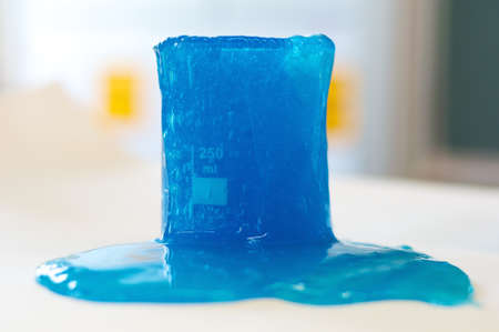 Hand of unrecognizable chemical researcher in rubber glove holding beaker of blue substance against white background