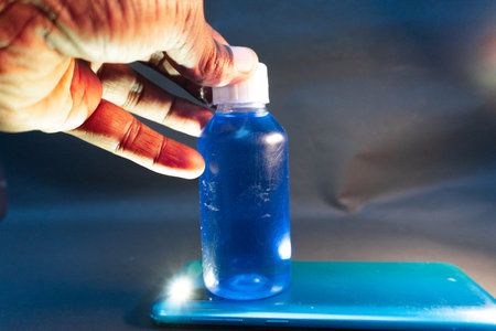 Hand holds a blue bottle of antiseptic gel on a blue background