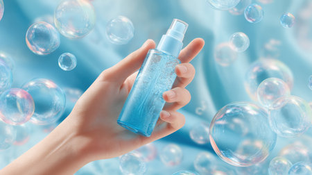 A hand holds a blue spray bottle among bubbles in a soft blue background. The scene is bright and focuses on the bottle and bubbles.