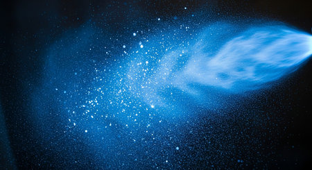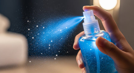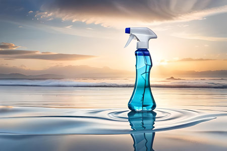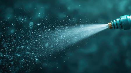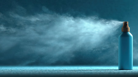 A blue spray bottle emits a fine mist, creating a dynamic visual effect against a dark background. This image captures the essence of freshness and purity.