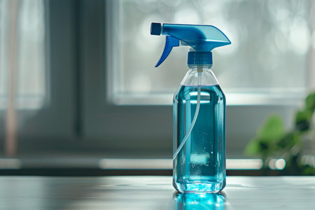 Blue spray bottle standing on a table indoors is ready for cleaning and disinfecting
