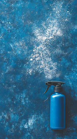 A blue spray bottle with a black nozzle stands on a textured blue surface with a sprayed flour-like effect. The artistic backdrop enhances the container.