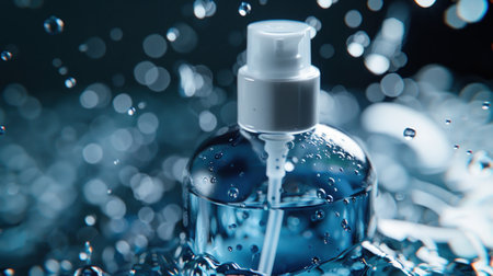 Blue liquid soap dispenser pump with splashes of water on blue background. generated by AI