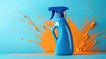 A striking blue spray bottle stands prominently against a vibrant orange paint splash, highlighting a dynamic contrast. Ideal for cleaning or artistic purposes.