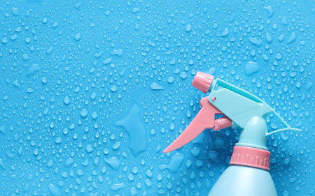 A blue spray bottle filled with detergent, highlighted against a bright turquoise background with an orange splash effect.