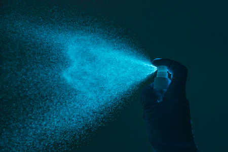 Woman doctor is spraying a antiseptic from a bottle in her hands on dark background.