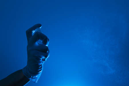 Hand in a medical glove holds an antiseptic for the treatment of hands on a blue background. Safety. The concept of viruses.