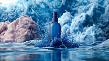 A deodorant bottle with cool blue liquid motion representing freshness on an icy blue background.