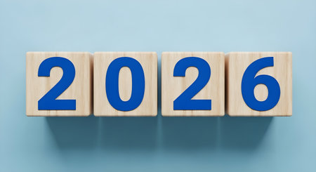 Four wooden blocks with the year 2026 printed in bold blue numbers on a light blue background