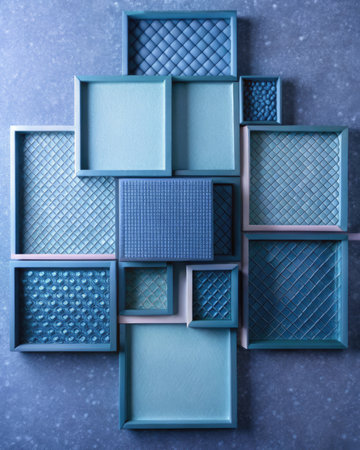 Abstract geometric wall art with various blue panels.