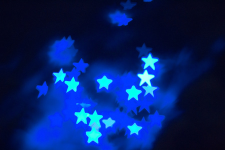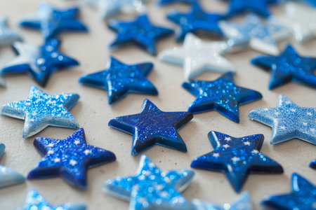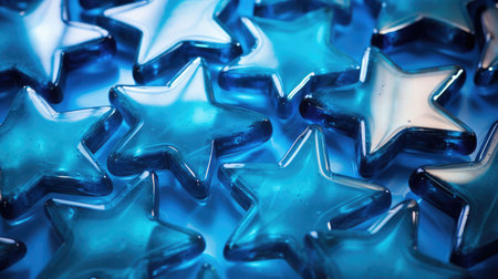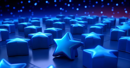 A mesmerizing arrangement of glowing blue stars scattered across a dark surface, enhanced by sparkling bokeh lights for a dreamy and magical atmosphere.