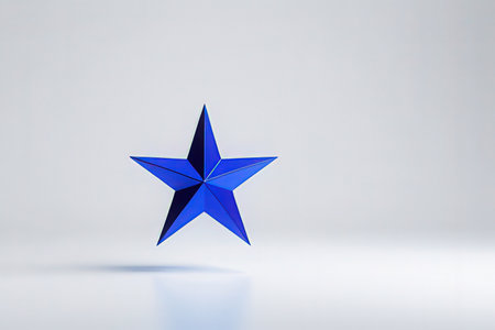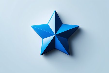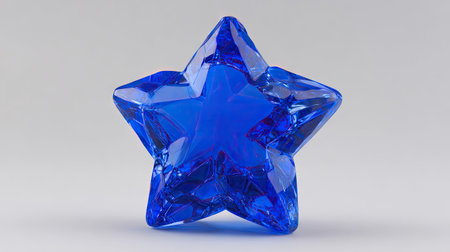 A radiant, translucent blue crystal star is featured against a simple, light gray backdrop. The polished surface reflects light, creating highlights and shadows within its symmetrical form. This composition, with its clean lines and appealing color, is suitable for various design projects, including digital art and promotional materials.