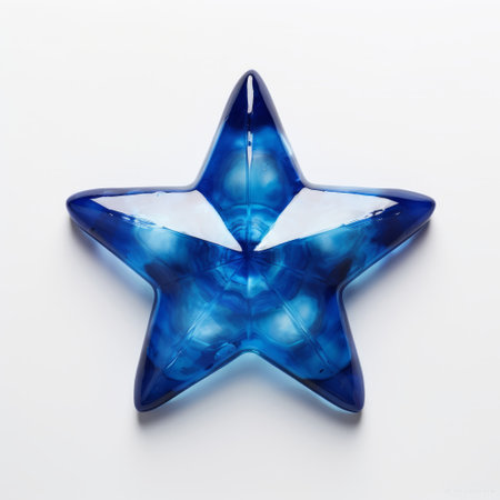 a blue star, crafted with bold chromaticity, is delicately placed on a silver plate. this hyperrealistic sculpture showcases a transparent-translucent medium, created using a combination of plastic, gemstone, and fujifilm velvia. the mottled texture adds depth and intrigue to this captivating piece of art. ai generated