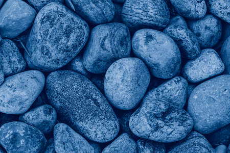 Closeup macro of big huge large blue stones rocks pebbles lying on ground. Natural eco environmental background texture. View from top above. Toned with classic blue 2020 color.