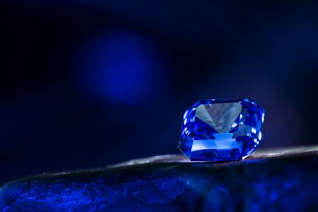 Tanzanite is a rare precious natural geological stone on black background in low key. Fashionable jewelry elegant decoration. AI generated. Header banner mockup with space.