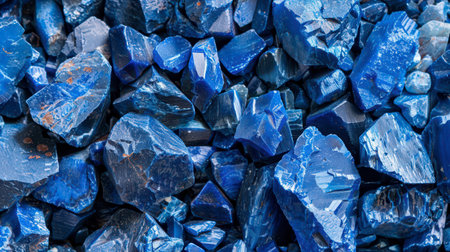 A close-up view of a collection of rough, blue lapis lazuli crystals, showcasing their vibrant color and natural texture.