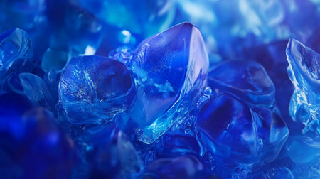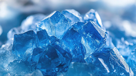 Close-up macro shot of radiant blue ice crystals, highlighting their sharp, transparent edges and intricate frozen textures.