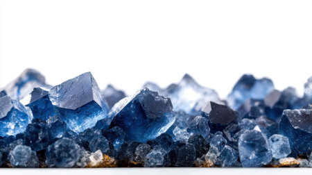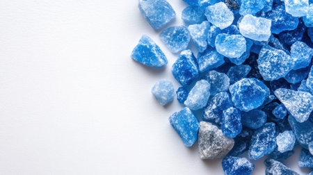 Sea salt crystal macro, deep blue mineral fragments arranged along edge of white background