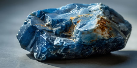 Raw blue crystal mineral stone against a soft grey backdrop. Gemology and precious stones concept. Design for poster, banner, header.