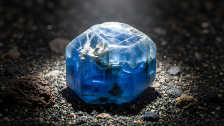 A radiant blue rough gemstone shimmering on a dark sandy surface with a mystic glow