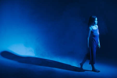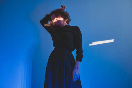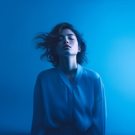 Under mesmerizing blue lights, a woman portrays grace with her hair dancing around her. The atmosphere captures a moment of tranquility and artistic expression, leaving a lasting impression.