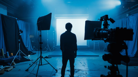 Behind the scenes or making of film in the studio and silhouette of camera man.