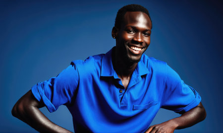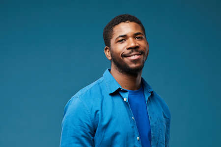 Portrait of smiling African American man wearing blue on blue background and looking at camera, copy space