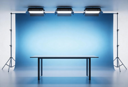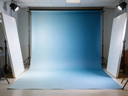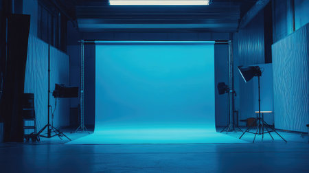 Empty photo studio with blue wall and lighting equipment in the background.