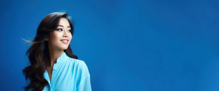 Woman smiling, blue background, studio portrait, website banner