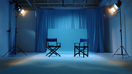 An empty film studio awaits the next big interview showcasing two director's chairs ready for action.