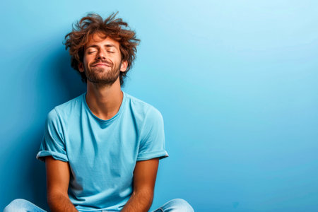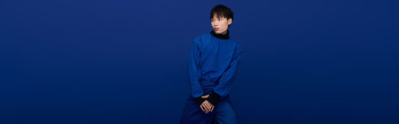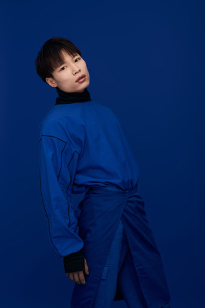 Young man in a blue background showcases his fashion sense thoughtfully.