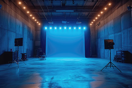 A spacious modern studio featuring blue lighting and professional equipment, ideal for various filming and photography projects, showcasing a creative environment.