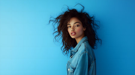 Fashion model young beautiful woman in a fashionable oversized blue denim jacket posing near blue wall. Female fashion concept
