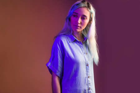 Close-up portrait of young bautiful girl attentively looking at camera, posing isolated over blue background in neon light