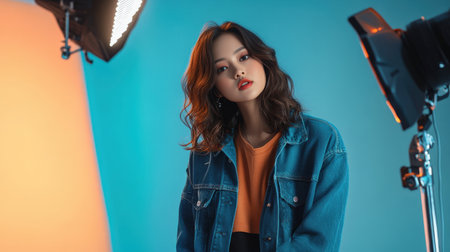 A fashion model confidently posing in a studio with expert lighting setup for a high-fashion shoot