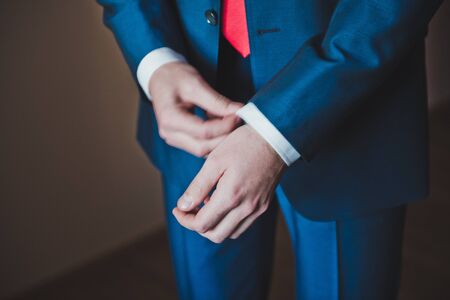 Groom in a black suit with a tie fastens a button on his suit close-up