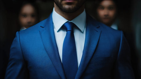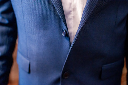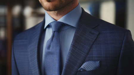 Closeup view of businessman in elegant blue suit and crisp white shirt, sophisticated professional fashion detail, warm light background ambiance, stylish corporate attire presentation