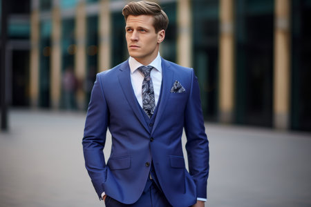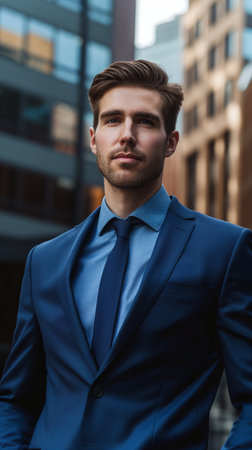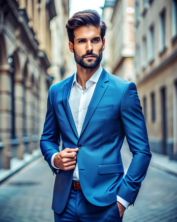 Elegant man in a tailored blue suit standing confidently in an upscale urban setting during evening hours Generative AI