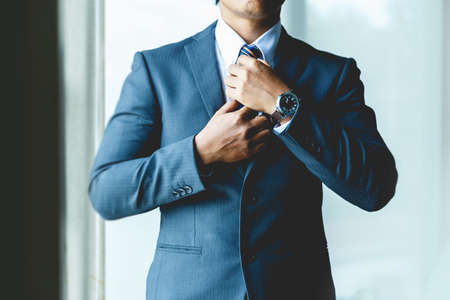The close up picture of the person is working as businessman and adjusting necktie, the business person require skill like the management, experience, communication, negotiation and marketing. AIG43.