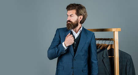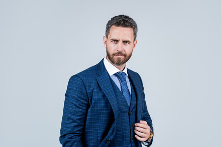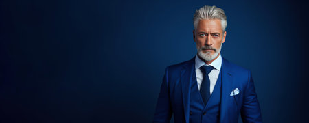 mature ambitious man businessman in businesslike suit has grizzled hair, business executive. Man face portrait, banner with copy space.