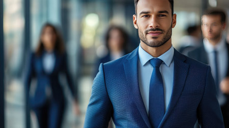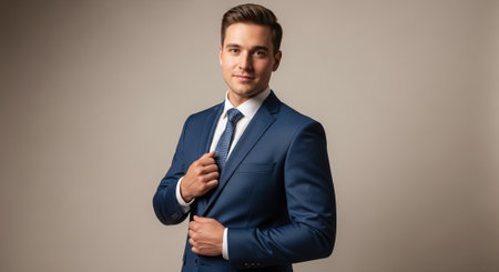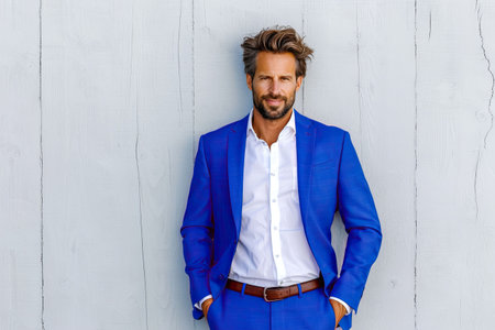 Confident businessman in a stylish blue suit stands against a light wooden backdrop, embodying professionalism and contemporary fashion in the business environment