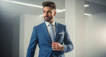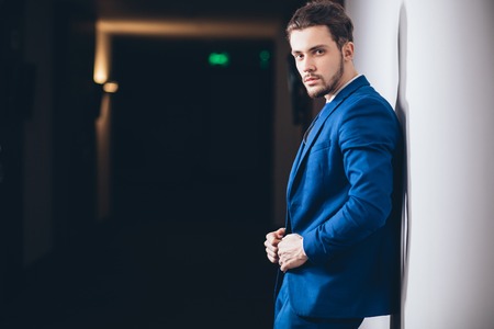 indoor photo of young handsome stylish businessman wearing suit