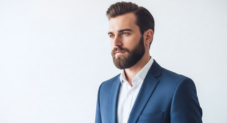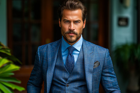 Close-up portrait of a sophisticated man dressed in a stylish blue suit, complemented by an elegant tie and pocket square, exuding confidence.