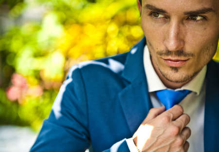 Man in custom tailored business suit posing. Handsome fashion