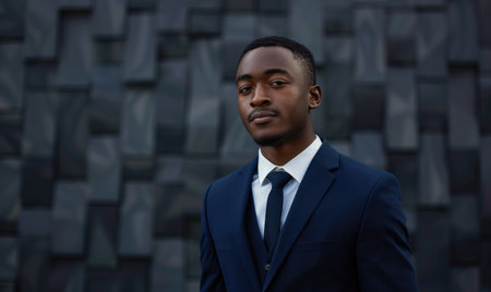 Portrait of confident african american businessman in a stylish suit standing against office building looking aside, copy space