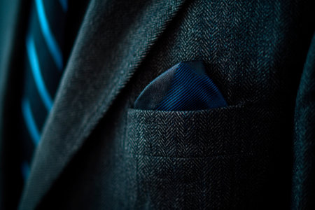 A close-up shot displaying a sophisticated suit jacket and a blue tie adorned with gold dots, showcasing a blend of modern elegance and professional style.