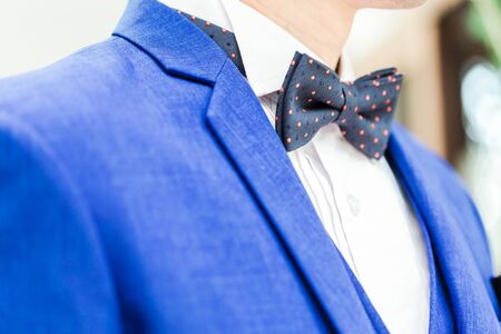 cropped man in bow tie blue suit. businessman isolated on white. gentleman in formalwear. copy space