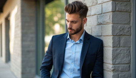 A dapper young man with a well-groomed beard and stylish hair leans casually against a stone wall, exuding confidence and sophistication. His tailored suit and light blue shirt create a striking contrast against the earthy tones of the wall, making him the focal point of this chic urban scene.